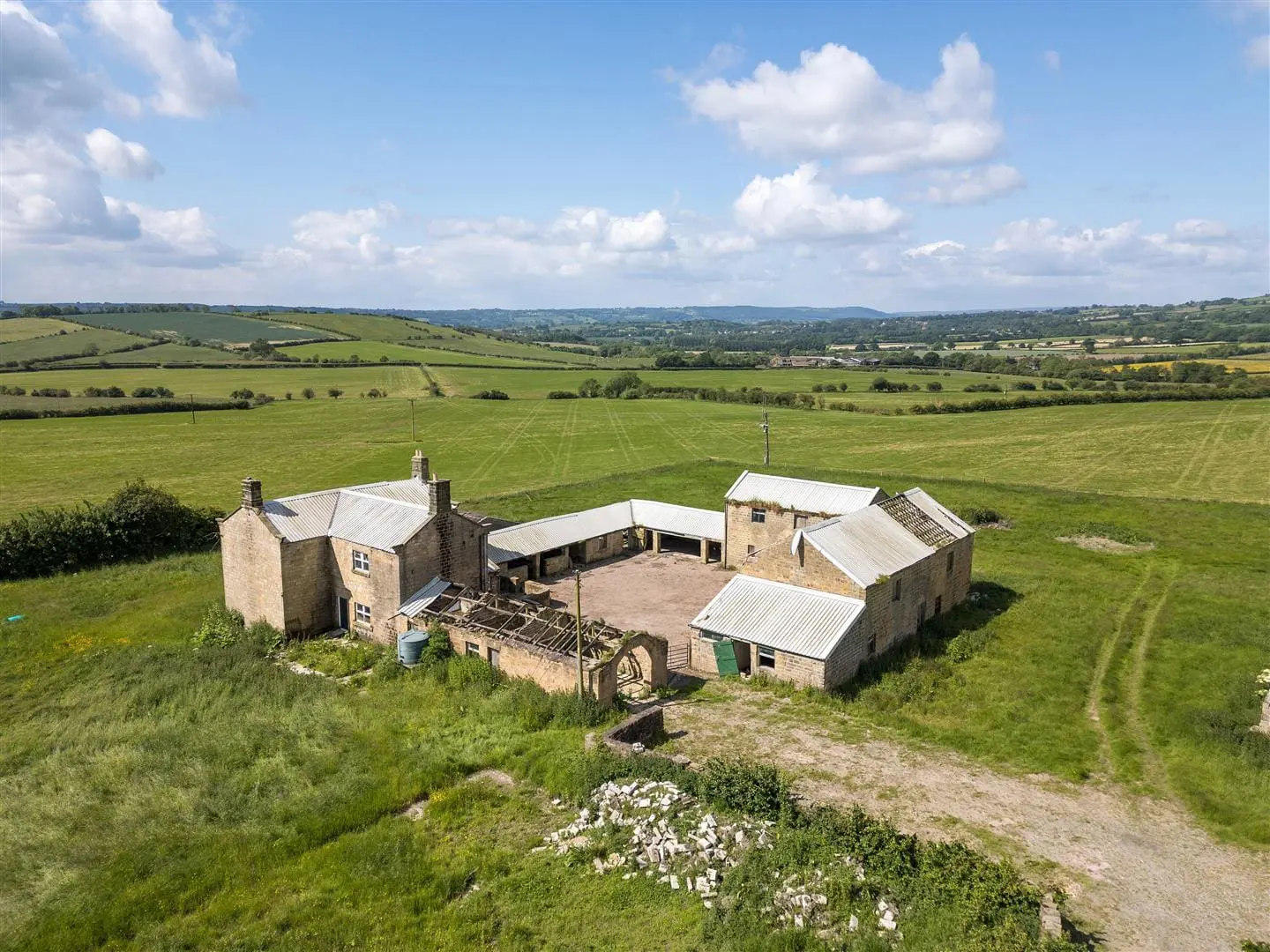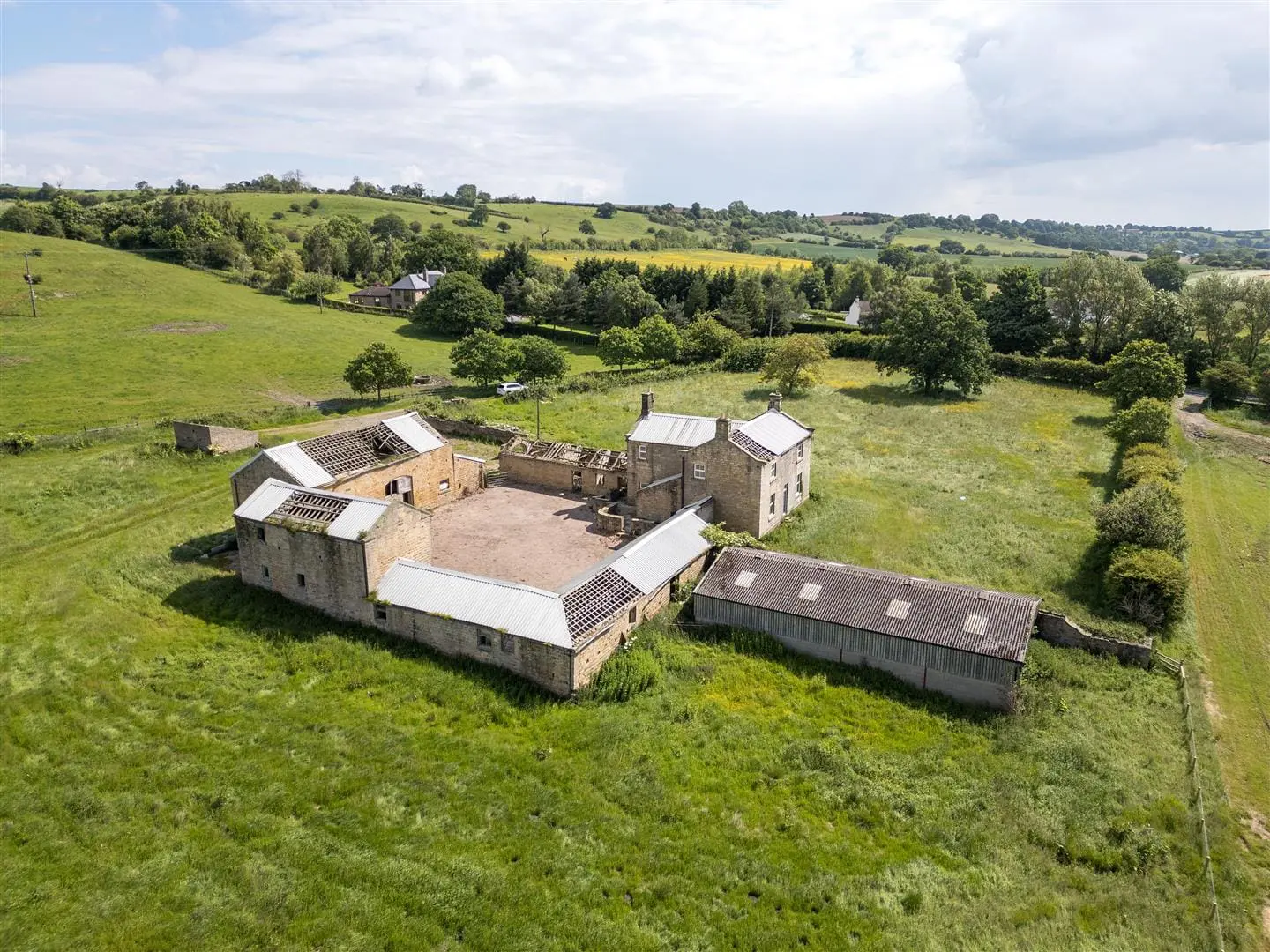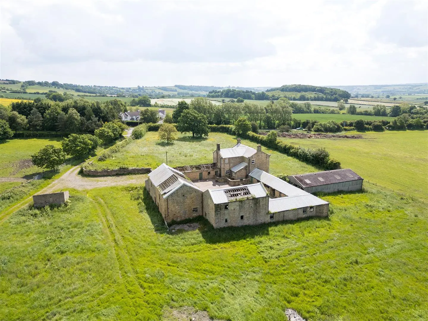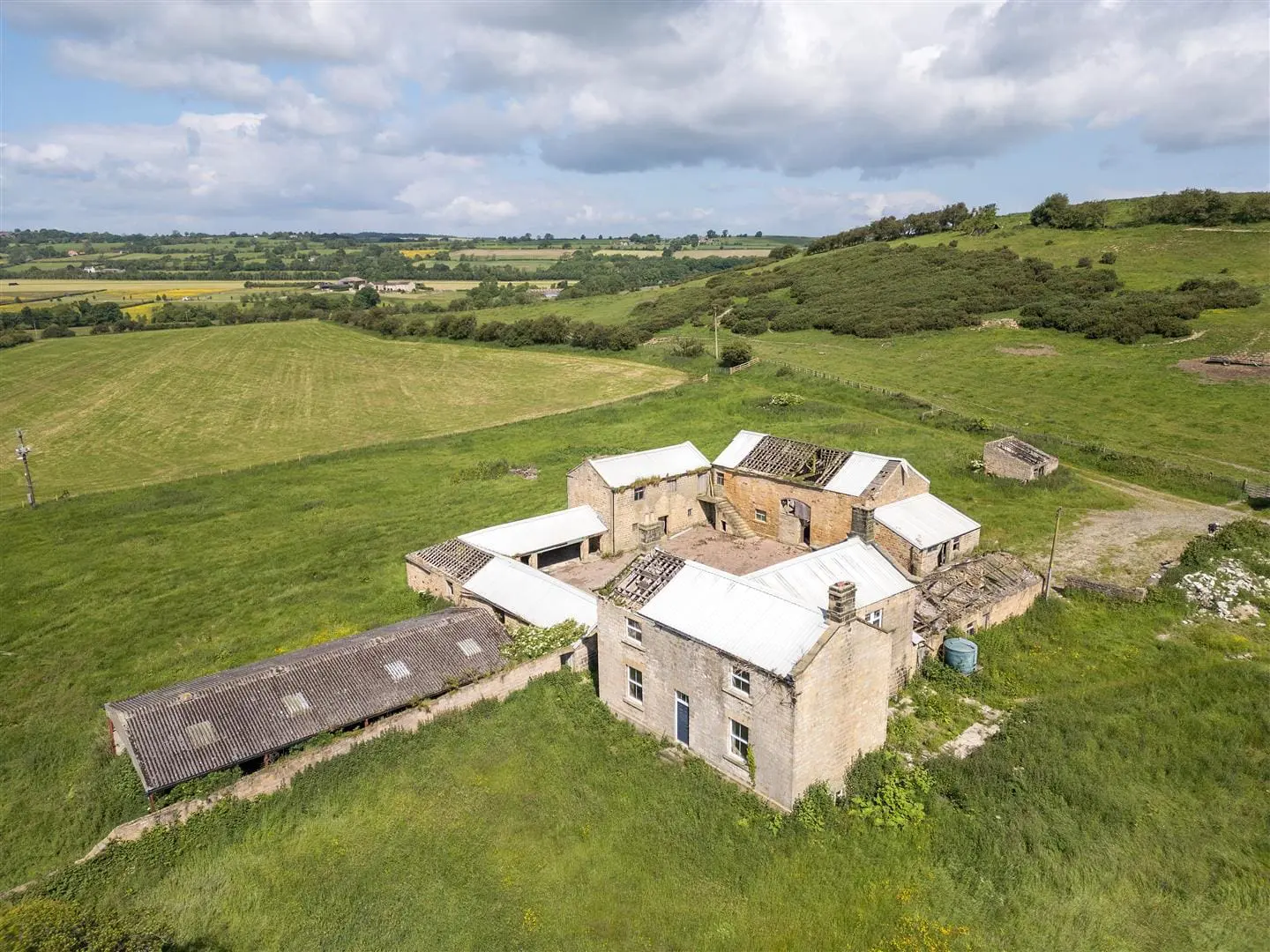 DEVELOPMENT OPPORTUNITY – A substantial range of farm buildings including a 4-bedroom house to modernise/rebuild plus two stone barns with historic permission to convert, plus further buildings with potential, in an enviable 3 acre rural setting south of Harrogate with a lovely southerly outlook and views over Lower Wharfedale. For sale as a whole.